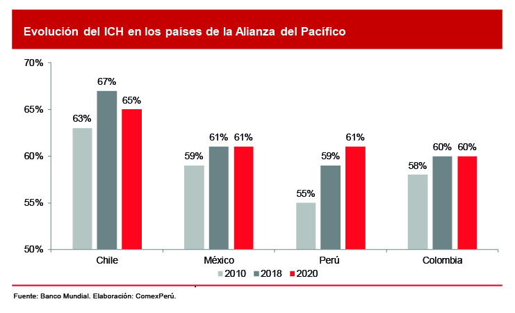Asimismo, cabe resaltar que nos encontramos por encima del ICH promedio de la región de Latinoamérica y el Caribe (0.56); no obstante, al compararnos con respecto a los miembros de la Alianza del Pacífico, ocupamos el tercer lugar, después de Chile, ubicado en el puesto 47, y México, en el puesto 61. Así, los resultados demuestran que aún queda mucho trabajo por hacer, más aún cuando se analiza la situación desde un punto de vista socioeconómico, pues, según un informe del Banco Mundial de 2019, un niño peruano nacido en el 20% de los hogares más ricos será un 68% productivo a los 18 años, mientras que uno nacido en el 20% más pobre solo lo será un 48%.