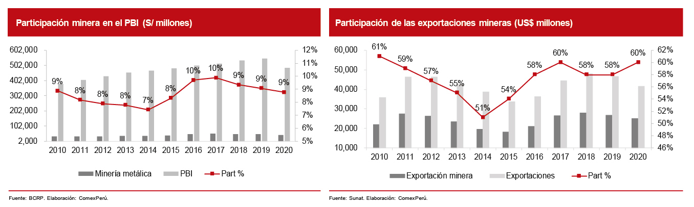 En cuanto a las exportaciones mineras metálicas, entre 2010 y 2020, estas alcanzaron un crecimiento acumulado del 14.2%, según cifras de la Sunat. En 2020, sumaron un valor total de S/ 25,029 millones, con una caída del 6.7% respecto de 2019. No obstante, representaron el 60% de las exportaciones totales en ese año. Asimismo, durante la última década, las exportaciones mineras representaron más del 50% de las exportaciones totales.