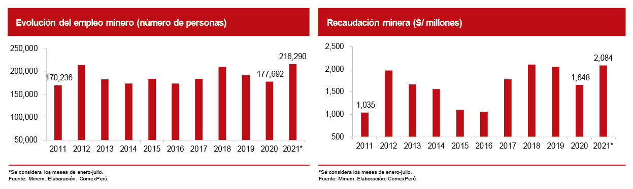 Por otro lado, de acuerdo con el Ministerio de Energía y Minas (Minem), para los meses de enero a julio de 2021, el sector minero empleó de manera directa un total de 216,290 trabajadores, lo que evidencia un incremento del 27% con relación al mismo periodo de 2020. Cabe resaltar que, entre los años 2011 y 2020, el empleo que generó esta actividad tuvo un crecimiento acumulado del 4.4%.