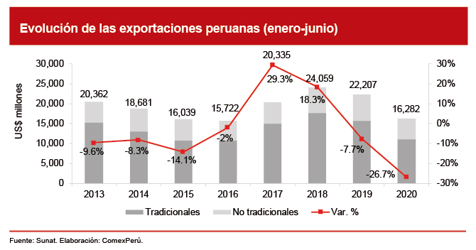 La menor demanda de nuestros principales destinos de exportación y la disminución de la producción local, como consecuencia de la crisis ocasionada por la COVID-19, siguen reflejándose en el bajo desempeño de nuestras exportaciones. Según cifras de la Sunat, estas sumaron un total de US$ 16,282 millones en el primer semestre del año, lo que evidenció una caída del 26.7% con respecto al primer semestre del año anterior. Particularmente, en el mes de junio se registró una caída del 32.2% respecto del mismo mes de 2019.