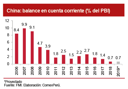 En las últimas décadas, China ha registrado, año tras año, superávits en su cuenta corriente. Así, por ejemplo, en 2007, según el Fondo Monetario Internacional (FMI), el gigante asiático registró un superávit de casi un 10% de su PBI. De esta manera, fue durante más de veinte años uno de los principales prestatarios del mundo. Sin embargo, tal como se observa en el gráfico, su superávit ha venido reduciéndose considerablemente y, en 2018, su cuenta corriente registró su valor más bajo de los últimos veintitrés años, al alcanzar un valor equivalente a solo un 0.7% de su PBI. Al respecto, el FMI prevé menores superávits para los próximos años, mientras que entidades financieras como Morgan Stanley y Barclays estiman un déficit para 2019 y años siguientes.