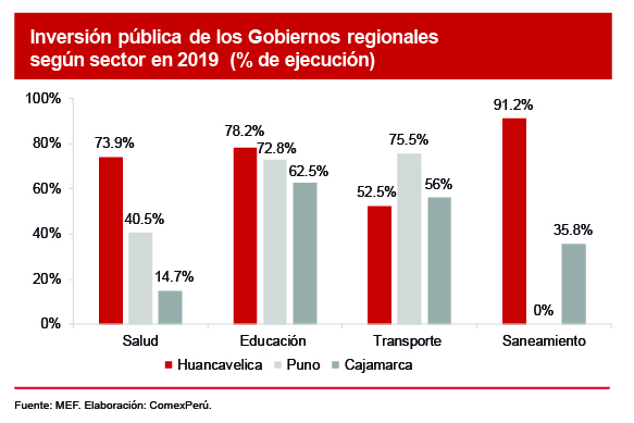 Frente al escenario presentado, se esperaría que los gastos presupuestales se hayan orientado, en cierta medida, a superar estos desafíos de los departamentos con mayor necesidad, pero la realidad ha sido bastante heterogénea. Según cifras del MEF, el presupuesto institucional modificado (PIM) para la inversión pública destinado a los Gobiernos regionales de Huancavelica, Puno y Cajamarca en 2019 fue de S/ 314 millones, S/ 400 millones y S/ 400 millones, respectivamente. Sin embargo, los resultados en materia de ejecución en algunos sectores con gran incidencia en la productividad evidencian que aún queda mucho por trabajar.