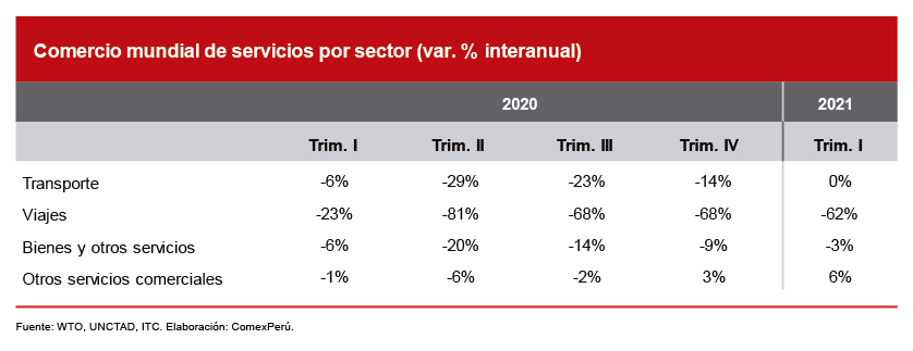Evidentemente, las medidas implementadas para contrarrestar la pandemia de la COVID-19 han afectado gravemente al sector, en particular los servicios de viajes y turismo, debido a las restricciones de movilidad y cancelación de los servicios turísticos. Según cifras de la Organización Mundial del Comercio (WTO, por sus siglas en inglés), el sector servicios registró una caída del 21% a nivel mundial, principalmente por una disminución en el sector viajes. Como se observa en el cuadro, este sector registró su caída máxima (81%) en el segundo trimestre del 2020. Por otro lado, el rubro otros servicios ha sido el menos afectado, con una caída máxima del 20% en el mismo trimestre. En la misma línea, durante el primer trimestre del 2021, se observó una baja del 9%.
