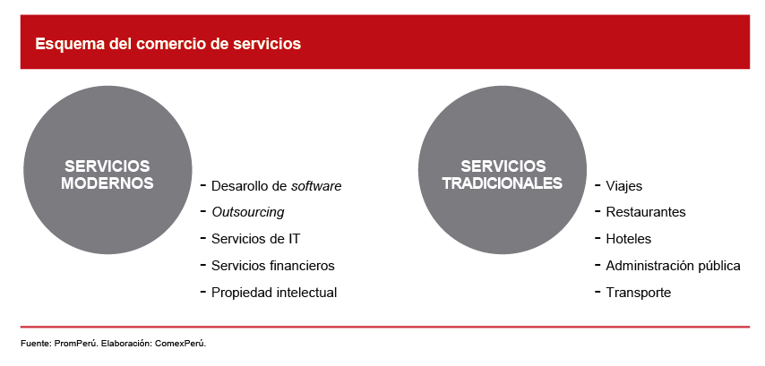 El comercio de servicios ha cobrado relevancia en los últimos años; sin embargo, no ha tenido el protagonismo que debería. De acuerdo con la Comisión de Promoción del Perú para la Exportación y el Turismo (PromPerú), en los países de la Organización para la Cooperación y el Desarrollo Económico, el sector servicios alcanza el 50% del valor total de productos exportables. Asimismo, este sector representa dos tercios del PBI de estos países, pero no están reflejados en las estadísticas como sí lo están los de manufactura.