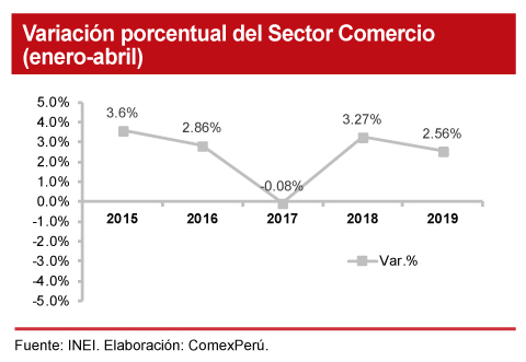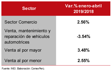 La semana pasada, el Instituto Nacional de Estadística e Informática (INEI) publicó el informe técnico sobre producción nacional, con cifras de enero a abril del presente año. En abril, como ya se expuso en distintos medios, la producción nacional creció únicamente un 0.02%, muy por debajo de lo alcanzado en abril de 2018 (+7.81%). Dicho resultado se sustentó, principalmente, en la disminución de los sectores manufactura (-13.20%), pesca (-63.02%) y minería (-2.87%), atenuada por la evolución positiva de los sectores construcción, comercio, telecomunicaciones, agropecuario, servicios prestados a empresas y otros servicios. Sin embargo, en el periodo enero-abril, la producción nacional creció un 1.68%, siendo el sector comercio uno de los que más aportó al crecimiento del PBI, con 0.29 puntos porcentuales (pp), solo por detrás de otros servicios (0.44 pp) y telecomunicaciones y otros servicios de información (0.31 pp). Cabe mencionar que el sector comercio comprende la venta, mantenimiento y reparación de vehículos automotores, así como la venta al por mayor y menor, de acuerdo con el INEI.