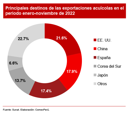 Ahora bien, con relación a los principales destinos, EE. UU. es el principal mercado, con un US$ 87 millones; sin embargo, este valor es significativamente menor (-30.3%) al de 2021. China (US$ 72 millones; +23.4%) y España (US$ 70; +48.7%) completan el top tres.