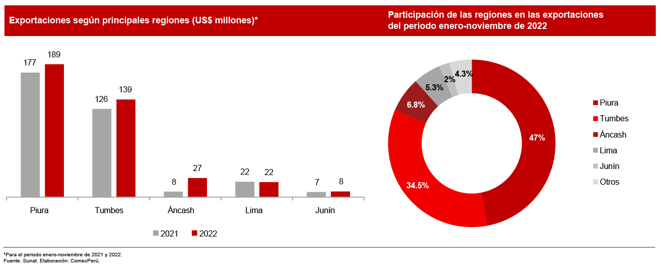 En cuanto al origen de las exportaciones, Piura es la región líder tanto en monto como en volumen exportado (18,267 TM); seguidamente se encuentra Tumbes. No obstante, estas regiones no presentaron una gran variación significativa respecto de las cifras registradas en 2021; es más, el volumen exportado por Piura en 2022 fue un 1.6% menos. En cambio, Áncash triplicó su monto exportado (+241.7%) y duplicó su volumen (+131.2%).