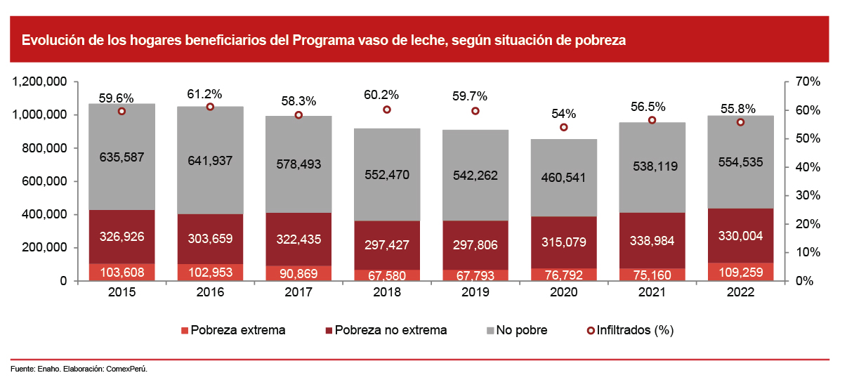 De acuerdo con estimaciones de la Encuesta Nacional de Hogares (Enaho), el PVL atendió a 993,798 hogares a nivel nacional en 2022. De esta cantidad, un total de 554,535 hogares (55.8% de los beneficiados) no estaban en condición de pobreza. Si analizamos la evolución durante los últimos años, destaca que suele haber más de medio millón de hogares no pobres beneficiarios, mientras que generalmente se registran menos de 100,000 hogares en condición de pobreza extrema.