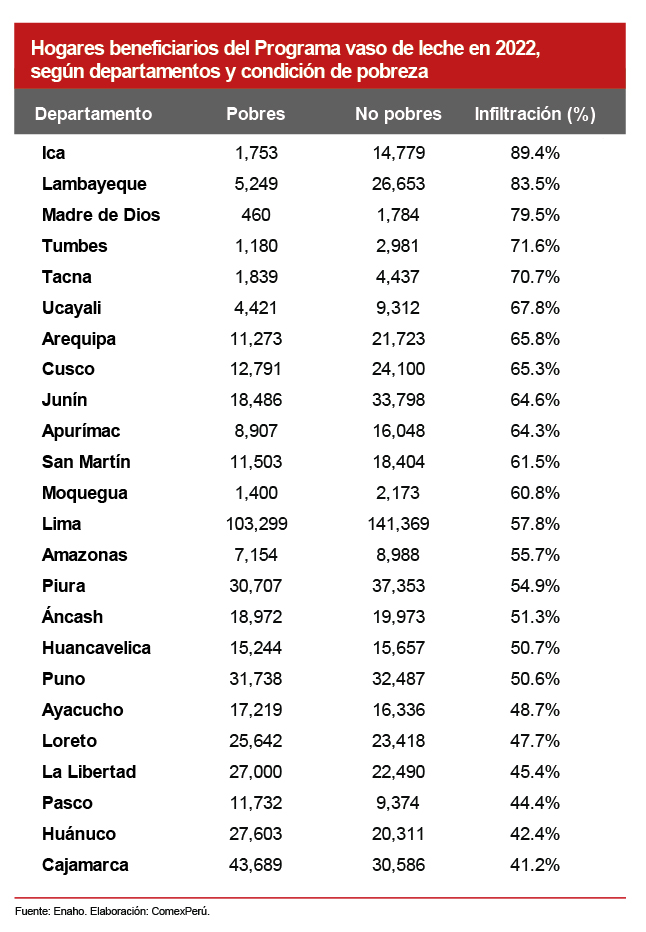 Esta situación se agrava en el interior del país, donde la proporción de hogares no pobres que se benefician del programa supera el 60% en 12 departamentos. Los peores resultados pertenecen a Ica (89.4% de hogares beneficiados no son pobres) y Lambayeque (83.5%). Pero en Madre de Dios (79.5%), Tumbes (71.6%) y Tacna (70.7%) la proporción de infiltrados también supera el 70%.