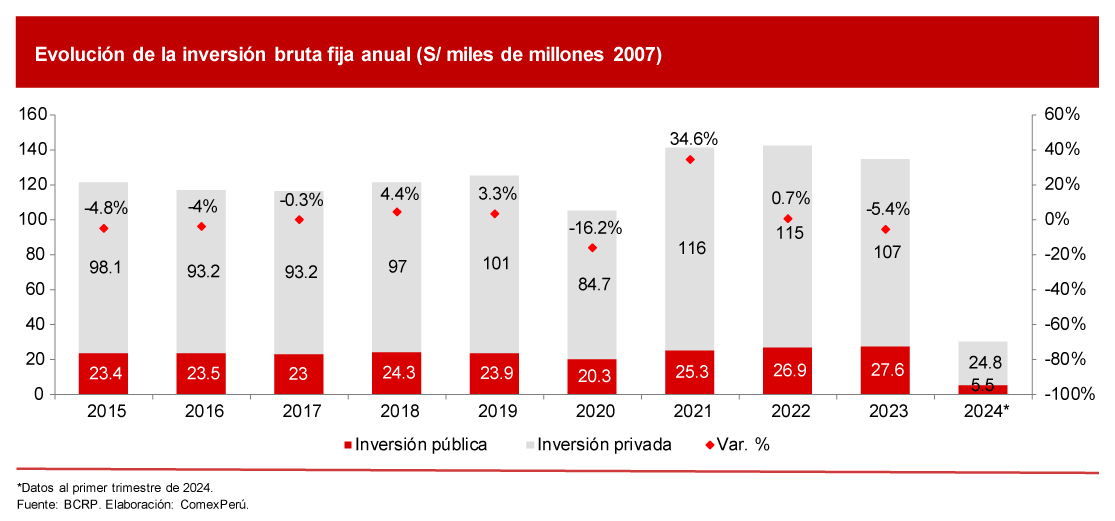 La inversión bruta fija representó un 23.8% del PBI en 2023, según cifras del Banco Central de Reserva del Perú (BCRP). El monto total se divide en inversión privada y pública. La primera fue, en promedio, cuatro veces mayor que la segunda en la última década. Es decir, por cada S/ 1 invertido por el Estado, el sector privado invierte S/ 4. Entre enero y marzo de 2024, la inversión privada ascendió a S/ 24,844 millones, lo que equivale al 81.9% del total de la inversión nacional. Esta cifra representa un aumento del 0.3% en comparación con el primer trimestre del año pasado.