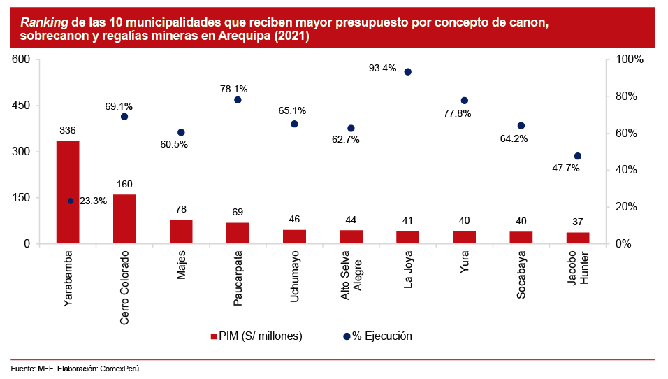 En 2021, después de Cusco y Áncash, Arequipa fue el tercer departamento que recibió las mayores transferencias por concepto de canon y regalías, lo que significó un total de S/ 1,212 millones transferidos a 109 municipalidades ese año. Asimismo, cabe mencionar que, en el período 2011-2021, el 44% de la inversión pública de los Gobiernos subnacionales de Arequipa ha sido financiado con recursos del canon, sobrecanon y regalías, según cifras del Ministerio de Economía y Finanzas (MEF).
