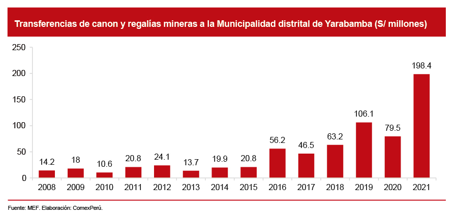 YARABAMBA, EL TERCER DISTRITO CON MAYOR PRESUPUESTO GENERADO POR LA MINERÍA A NIVEL NACIONAL, SOLO EJECUTÓ EL 23.3% DE LO QUE RECIBIÓ EN 2021