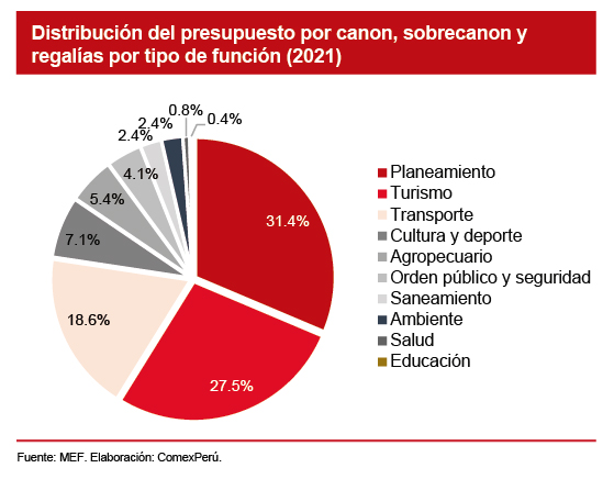 Por otro lado, al analizar el presupuesto por función, se observa una evidente mala priorización del gasto de los recursos de canon y regalías. En 2021, la función de planeamiento concentró el 31.4%; seguida por turismo, con el 27.5%; transporte, con el 18.6%; y cultura y deporte, con el 7.1%. Por su parte, para saneamiento se destinó 2.4%, y para salud y educación —en su conjunto— solo se destinó el 1.2% (S/ 3.8 millones).