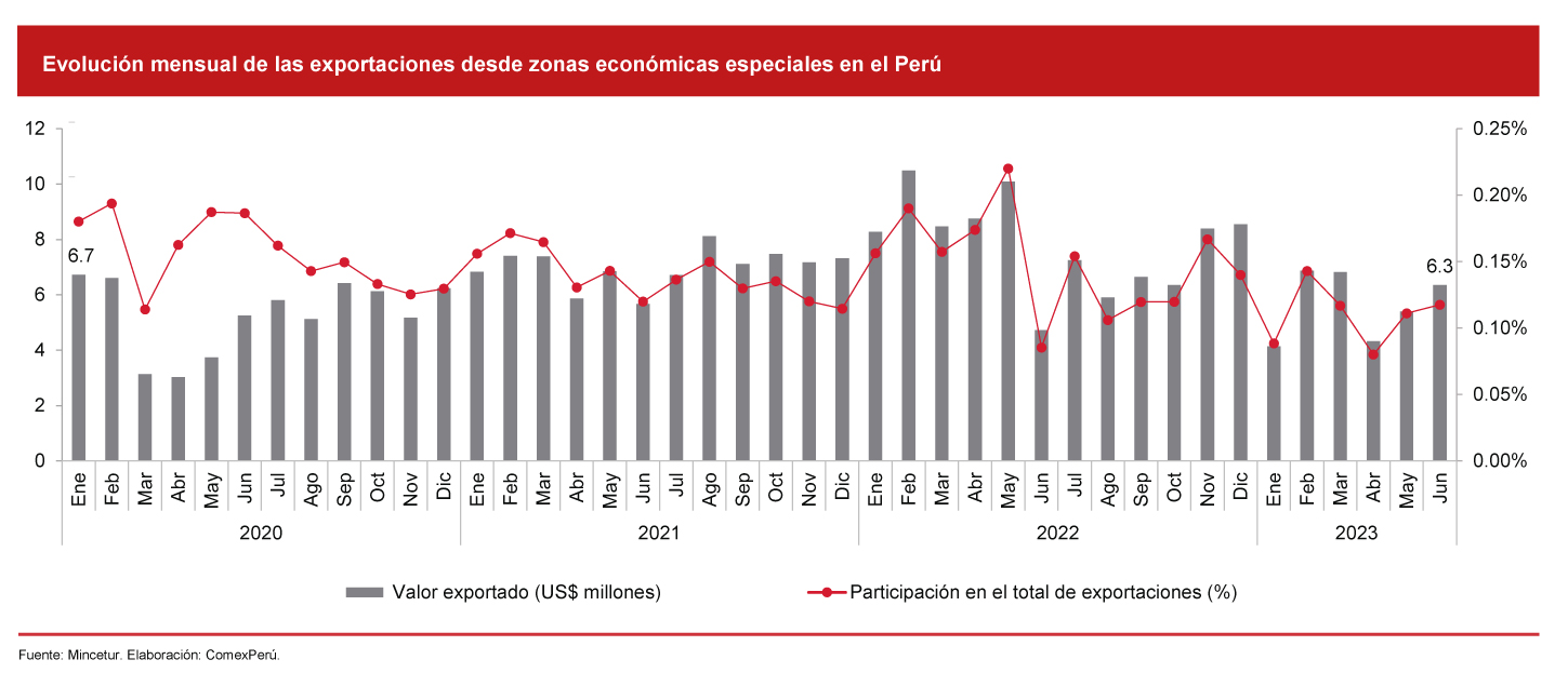Según el Boletín Informativo de Zonas Económicas Especiales, del Mincetur, al cierre de 2022, las exportaciones desde las ZEE sumaron US$ 93.9 millones, lo que significó un incremento del 11.9% en comparación con 2021 (US$ 84 millones). Sin embargo, en el primer semestre del presente año, las ZEE experimentaron una disminución significativa en sus exportaciones, con un total de US$ 33.9 millones, lo que representó una caída del 33.3% en comparación con el mismo período del año anterior. Este declive sería atribuido principalmente a la drástica reducción en las exportaciones del sector pesquero desde las ZEE, que se desplomaron a solo US$ 1.1 millones, un descenso del 88.3% con respecto al primer semestre de 2022. Además, aunque la situación actual del sector pesquero también ha impactado negativamente en las exportaciones totales de Perú, es relevante destacar que las ZEE han reducido su participación en el conjunto de las exportaciones peruanas, con tan solo un 0.11%.