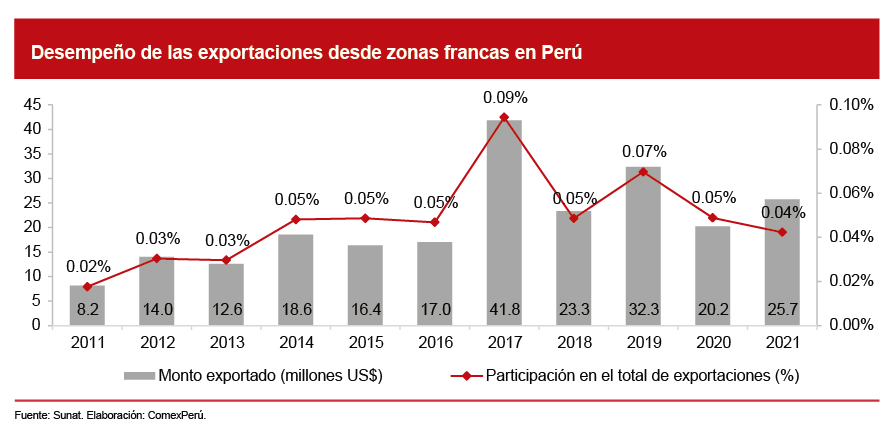De acuerdo con información de la Sunat, las exportaciones de las zonas francas en nuestro país en 2021 alcanzaron los US$ 25.7 millones, lo que representa únicamente el 0.04% del total exportado. En la última década, esta participación ha sido mínima, sin tendencia al crecimiento o el posicionamiento dentro del total de envíos al exterior. Ello a pesar de que, según la Organización Mundial de Zonas Francas, las experiencias económicas más exitosas en torno a estas áreas se han evidenciado en países en desarrollo que siguen una estrategia orientada a las exportaciones.