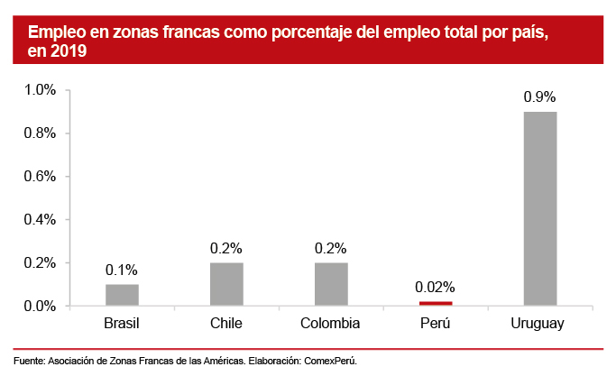 Por otro lado, al evaluar las cifras de empleo en las zonas francas, como porcentaje del empleo total, el país aún se encuentra rezagado. Mientras que, en pares de la región como Colombia o Chile, esta participación es de alrededor del 0.2%, en el Perú alcanzó el 0.02%, en 2019, según la Asociación de Zonas Francas para las Américas.